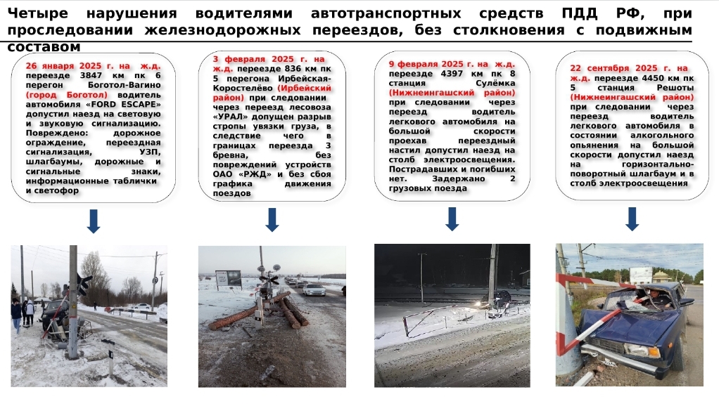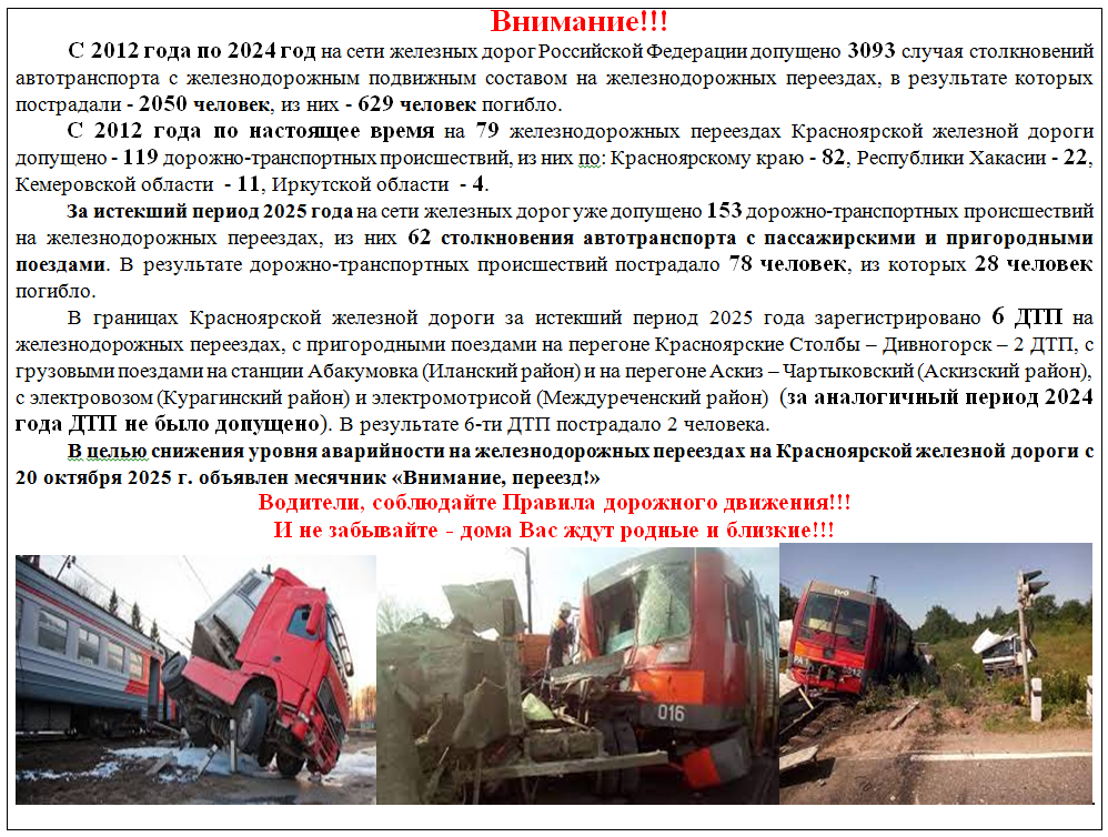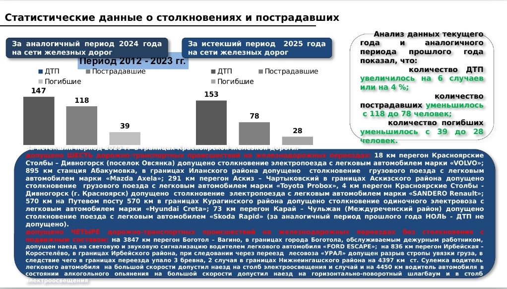 За истекший период 2025 года на сети железных дорог допущено 153 дорожно-транспортных происшествий на железнодорожных переездах, что на 4% больше в сравнении с аналогичным периодом прошлого года. В результате происшествий пострадали 78 человек, из которых 28 человек погибли