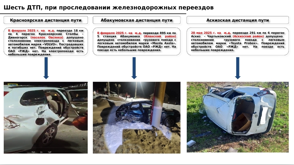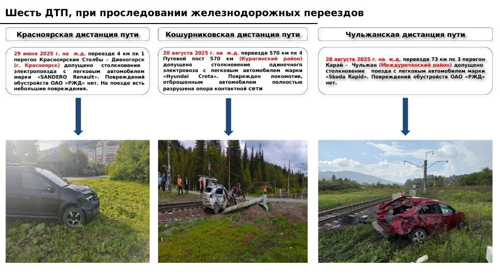 С начала года на полигоне Красноярской железной дороги зарегистрировано 6 случаев столкновения железнодорожного подвижного состава с автотранспортными средствами на железнодорожных переездах, в результате которых пострадали 2 человека (за аналогичный период прошлого года ДТП не допущено)
